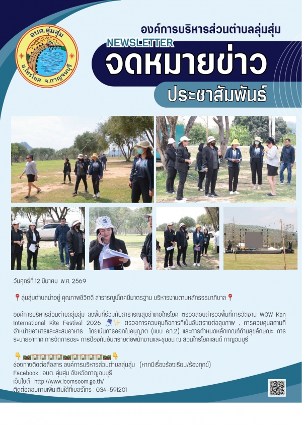 องค์การบริหารส่วนตำบลลุ่มสุ่ม ลงพื้นที่ร่วมกับสาธารณสุขอำเภอไทรโยค ตรวจสอบสำรวจพื้นที่การจัดงาน WOW Kan International Kite Festival 2026 ตรวจการควบคุมกิจการที่เป็นอันตรายต่อสุขภาพ , การควบคุมสถานที่จำหน่ายอาหารและสะสมอาหาร โดยเน้นการออกใบอนุญาต (แบบ อภ.