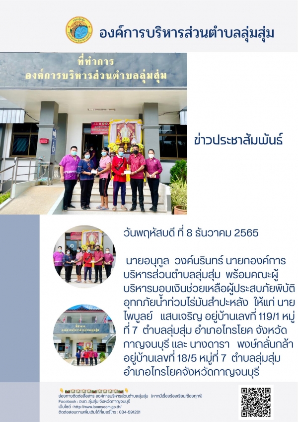 นายอนุกูล วงค์นรินทร์ นายกองค์การบริหารส่วนตำบลลุ่มสุ่ม พร้อมคณะผู้บริหารมอบเงินช่วยเหลือผู้ประสบภัยพิบัติอุทกภัยน้ำท่วมไร่มันสำปะหลัง ให้แก่ นายไพบูลย์ แสนเจริญ อยู่บ้านเลขที่ 119/1 หมู่ที่ 7 ตำบลลุ่มสุ่ม อำเภอไทรโยค จังหวัดกาญจนบุรี และ นางดารา พงษ์กลั่