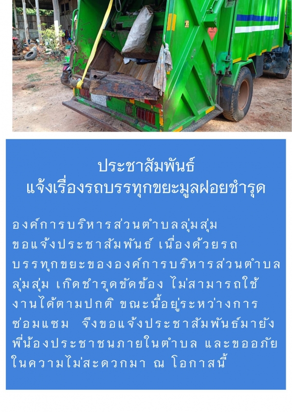 ประชาสัมพันธ์ เรื่องรถบรรทุกขยะมูลฝอยชำรุด