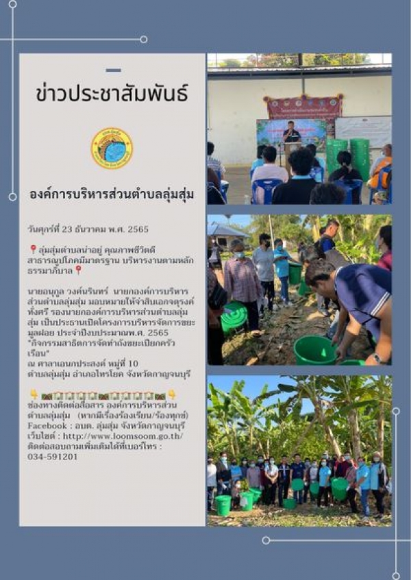 นายอนุกูล วงค์นรินทร์ นายกองค์การบริหารส่วนตำบลลุ่มสุ่ม มอบหมายให้จ่าสิบเอกจตุรงค์ ทั่งศรี รองนายกองค์การบริหารส่วนตำบลลุ่มสุ่ม เป็นประธานเปิดโครงการบริหารจัดการขยะมูลฝอย ประจำปีงบประมาณ พ.ศ. 2566 "กิจกรรมสาธิตการจัดทำถังขยะเปียกครัวเรือน"