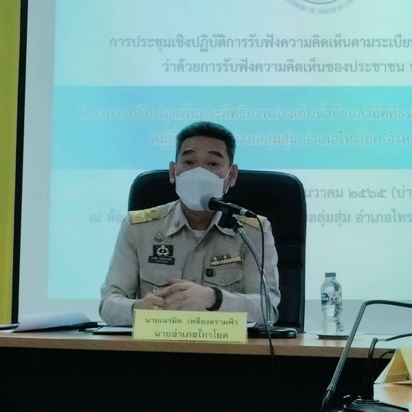 นายเนรมิต เหลืองอร่ามฟ้า นายอำเภอไทรโยค เป็นประธานกล่าวเปิดการประชุมเชิงปฎิบัติการการรับฟังความคิดเห็นตามระเบียบสำนักนายกรัฐมนตรีว่าด้วยการรับฟังความคิดเห็นของประชาชน พ.ศ.2548 ในพื้นที่ลุ่มน้ำแม่กลอง ประจำปี 2565 โดยมี นายอนุกูล วงค์นรินทร์ นายกองค์การบริ