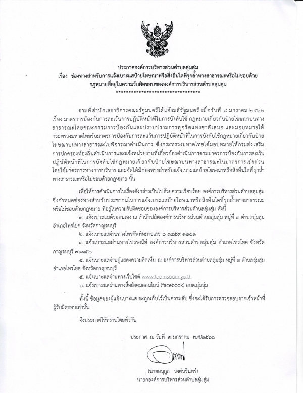 ประกาศองค์การบริหารส่วนตำบลลุ่มสุ่ม เรื่อง ช่องทางการแจ้งเบาะแสป้ายโฆษณาหรือสิ่งอื่นใดที่รุกล้ำทางสาธารณะหรือไม่ชอบด้วยกฎหมายที่อยู่ในความรับผิดชอบขององค์การบริหารส่วนตำบลลุ่มสุ่ม