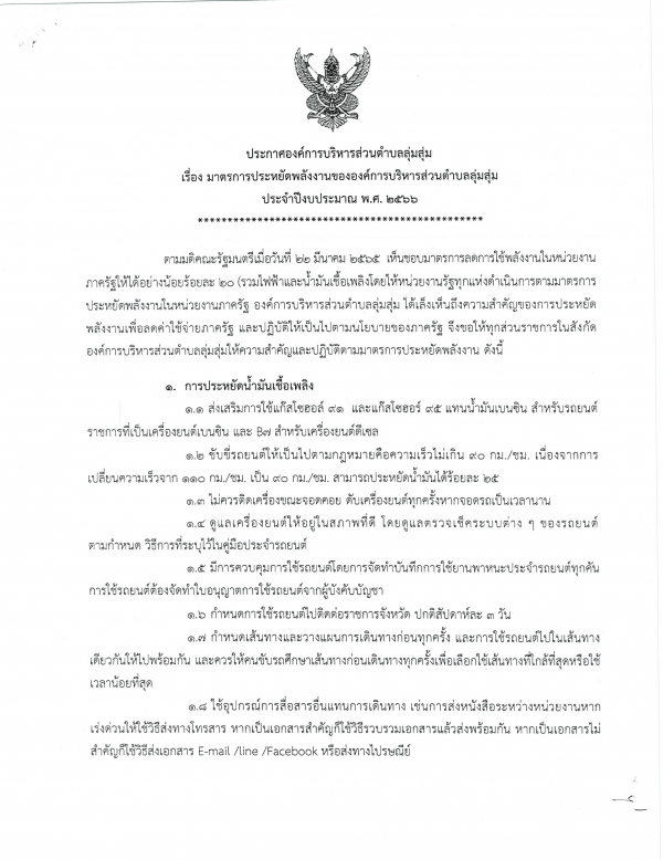 ประกาศองค์การบริหารส่วนตำบลลุ่มสุ่ม เรื่อง มาตรการประหยัดพลังงานขององค์การบริหารส่วนตำบลลุ่มสุ่ม ประจำปีงบประมาณ พ.ศ.2566