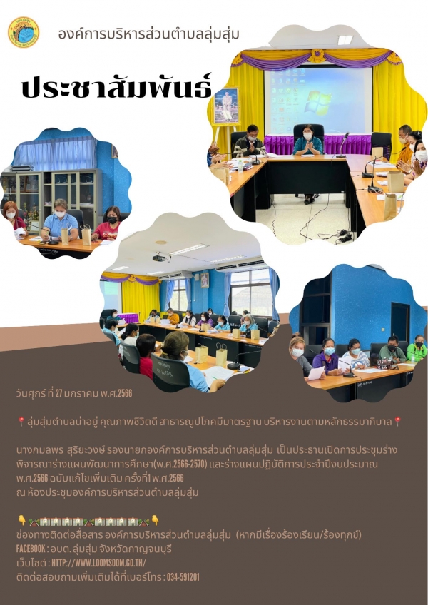 นางกมลพร สุริยะวงษ์ รองนายกองค์การบริหารส่วนตำบลลุ่มสุ่ม เป็นประธานเปิดการประชุมร่างพิจารณาร่างแผนพัฒนาการศึกษา(พ.ศ.2566-2570) และร่างแผนปฏิบัติการประจำปีงบประมาณ พ.ศ.2566 ฉบับแก้ไขเพิ่มเติม ครั้งที่ 1 พ.ศ.2566 ณ ห้องประชุมองค์การบริหารส่วนตำบลลุ่มสุ่ม