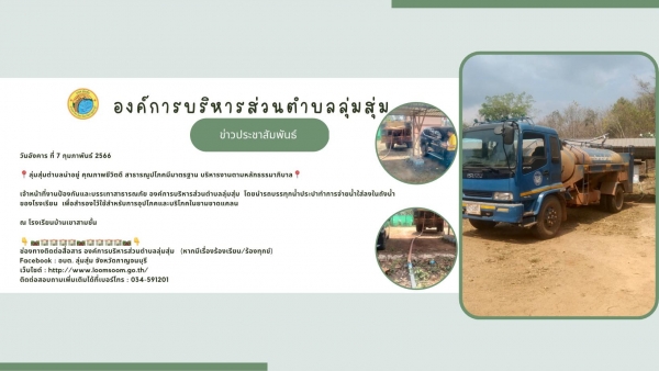 เจ้าหน้าที่งานป้องกันและบรรเทาสาธารณภัย องค์การบริหารส่วนตำบลลุ่มสุ่ม นำรถบรรทุกน้ำประปาทำการจ่ายน้ำใส่ลงในถังน้ำของโรงเรียน เพื่อสำรองไว้ใช้สำหรับการอุปโภคและบริโภคในยามขาดแคลน