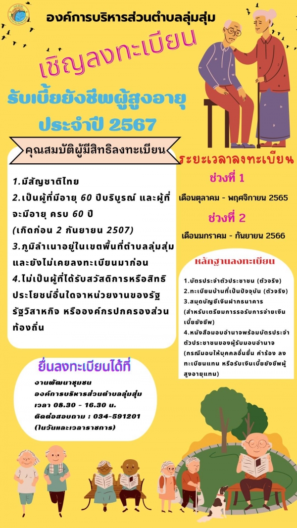 การลงทะเบียนรับเงินเบี้ยยังชีพผู้สูงอายุ ประจำปีงบประมาณ พ.ศ.2567 (สำหรับผู้สูงอายุลงทะเบียนรายใหม่ และยังไม่เคยลงทะเบียนมาก่อน)