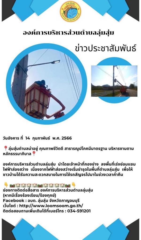 องค์การบริหารส่วนตำบลลุ่มสุ่ม นำโดยเจ้าหน้าที่กองช่าง ลงพื้นที่เร่งซ่อมแซมไฟฟ้าส่องสว่างสาธารณะ เนื่องจากไฟฟ้าส่องสว่างเริ่มชำรุดในพื้นที่ตำบลลุ่มสุ่ม เพื่อให้ชาวบ้านได้รับความสะดวกสบายในการใช้รถสัญจรไปมาในช่วงเวลาค่ำคืน