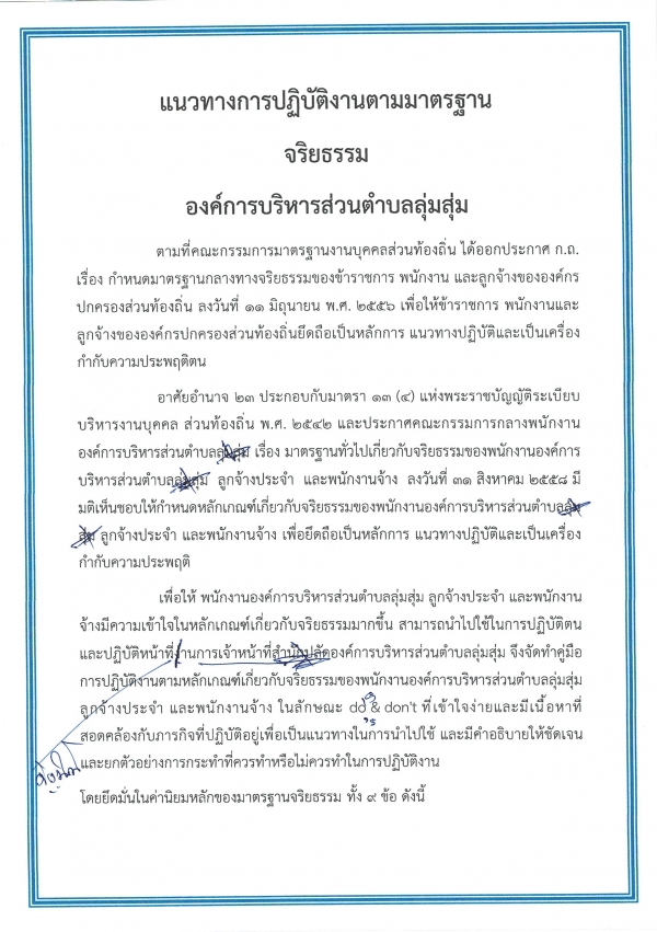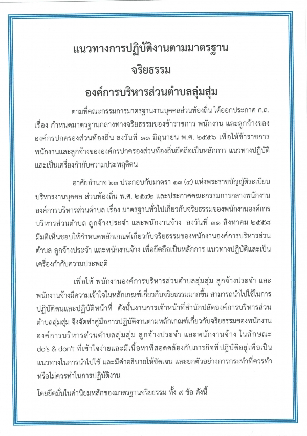 แนวทางการปฏิบัติงานตามมาตรฐานจริยธรรมองค์การบริหารส่วนตำบลลุ่มสุ่ม