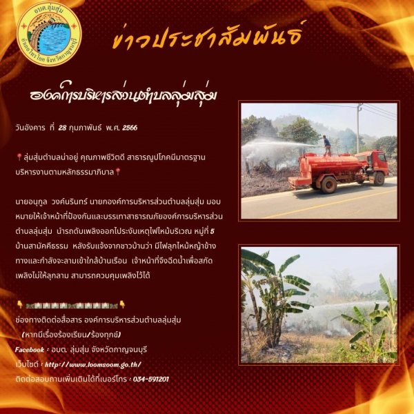 นายอนุกูล วงค์นรินทร์ นายกองค์การบริหารส่วนตำบลลุ่มสุ่ม มอบหมายให้เจ้าหน้าที่ป้องกันและบรรเทาสาธารณภัยองค์การบริหารส่วนตำบลลุ่มสุ่ม นำรถดับเพลิงออกไประงับเหตุไฟไหม้บริเวณ หมู่ที่ 5 บ้านสามัคคีธรรม หลังรับแจ้งจากชาวบ้านว่า มีไฟลุกไหม้หญ้าข้างทางและกำลัง