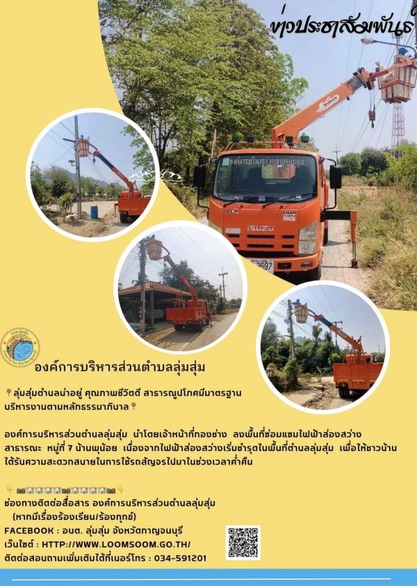 องค์การบริหารส่วนตำบลลุ่มสุ่ม นำโดยเจ้าหน้าที่กองช่าง ลงพื้นที่ซ่อมแซมไฟฟ้าส่องสว่างสาธารณะ หมู่ที่ 7 บ้านพุน้อย เนื่องจากไฟฟ้าส่องสว่างเริ่มชำรุดในพื้นที่ตำบลลุ่มสุ่ม เพื่อให้ชาวบ้านได้รับความสะดวกสบายในการใช้รถสัญจรไปมาในช่วงเวลาค่ำคืน