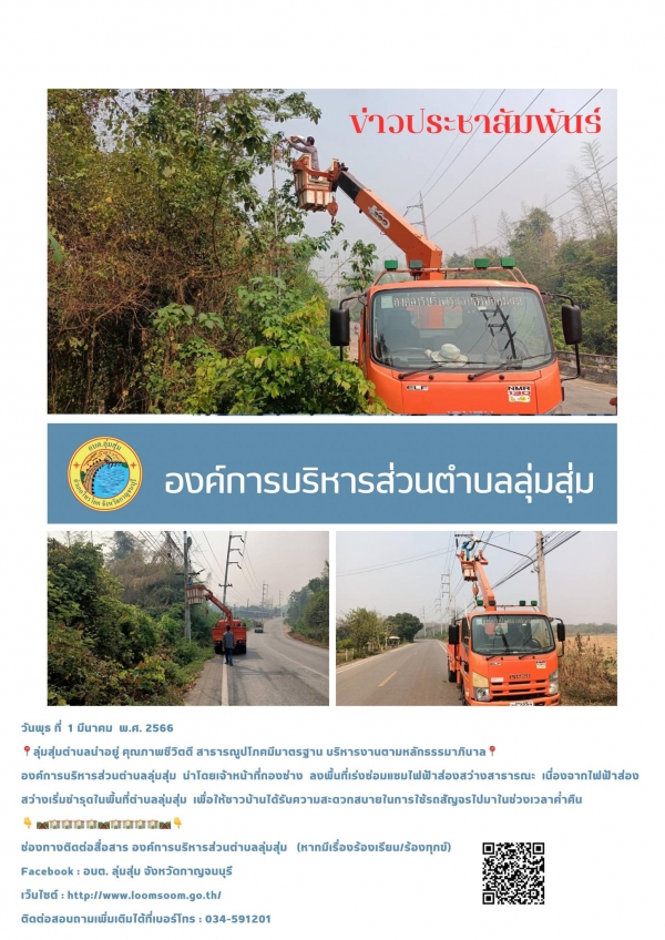 องค์การบริหารส่วนตำบลลุ่มสุ่ม มอบหมายให้เจ้าหน้าที่กองช่าง ลงพื้นที่เร่งซ่อมแซมไฟฟ้าส่องสว่างสาธารณะ เนื่องจากไฟฟ้าส่องสว่างเริ่มชำรุดในพื้นที่ตำบลลุ่มสุ่ม เพื่อให้ชาวบ้านได้รับความสะดวกสบายในการใช้รถสัญจรไปมาในช่วงเวลาค่ำคืน