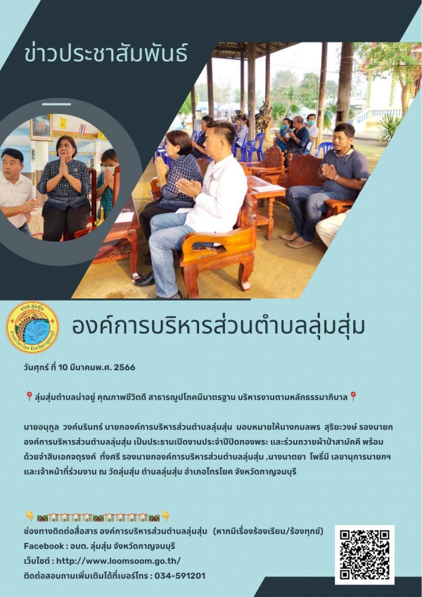 นายอนุกูล วงค์นรินทร์ นายกองค์การบริหารส่วนตำบลลุ่มสุ่ม มอบหมายให้นางกมลพร สุริยะวงษ์ รองนายกองค์การบริหารส่วนตำบลลุ่มสุ่ม เป็นประธานเปิดงานประจำปีปิดทองพระ และร่วมถวายผ้าป่าสามัคคี พร้อมด้วยจ่าสิบเอกจตุรงค์ ทั่งศรี รองนายกองค์การบริหารส่วนตำบลลุ่มสุ่ม ,นางนาตยา โพธิ์มี เลขานุการนายกฯ และเจ้าหน้าที่ ร่วมงาน ณ วัดลุ่มสุ่ม ตำบลลุ่มสุ่ม อำเภอไทรโยค จังหวัดกาญจนบุรี