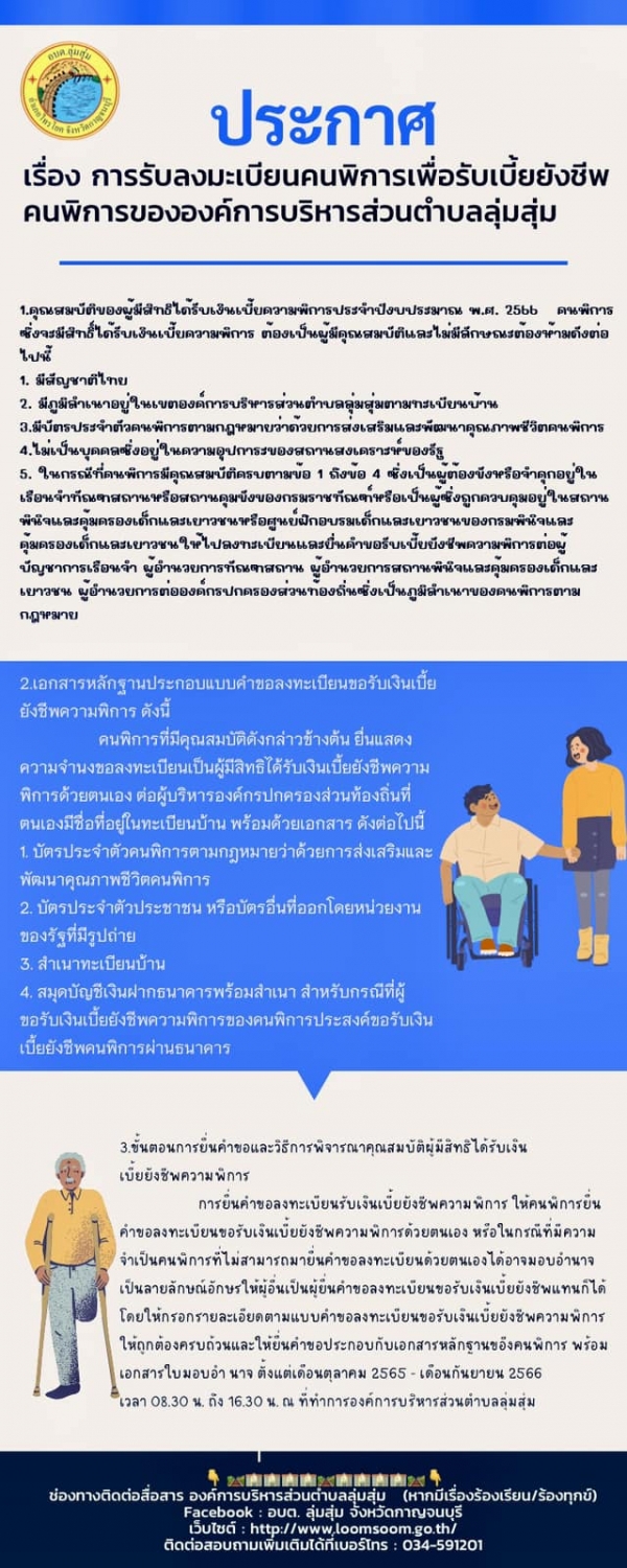 ประกาศองค์การบริหารส่วนตำบลลุ่มสุ่ม เรื่อง การรับลงทะเบียนคนพิการเพื่อรับเบี้ยยังชีพความพิการขององค์การบริหารส่วนตำบลลุ่มสุ่ม ประจำปีงบประมาณ 2566 1.คุณสมบัติของผู้มีสิทธิได้รับเงินเบี้ยความพิการประจำปีงบประมาณ พ.ศ. 2566 คนพิการซึ่งจะมีสิทธิ์ได้รับเงินเ