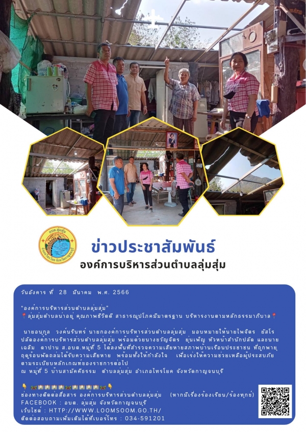 นายอนุกูล วงค์นรินทร์ นายกองค์การบริหารส่วนตำบลลุ่มสุ่ม มอบหมายให้นายไพจิตร ยัสโร ปลัดองค์การบริหารส่วนตำบลลุ่มสุ่ม พร้อมด้วยนางขวัญจิตร ยุ่นเพ็ญ หัวหน้าสำนักปลัด และนายเฉลิม ดาปาน ส.อบต.หมู่ที่ 5 ได้ลงพื้นที่สำรวจความเสียหายสภาพบ้านเรือนประชาชน ที่ถ