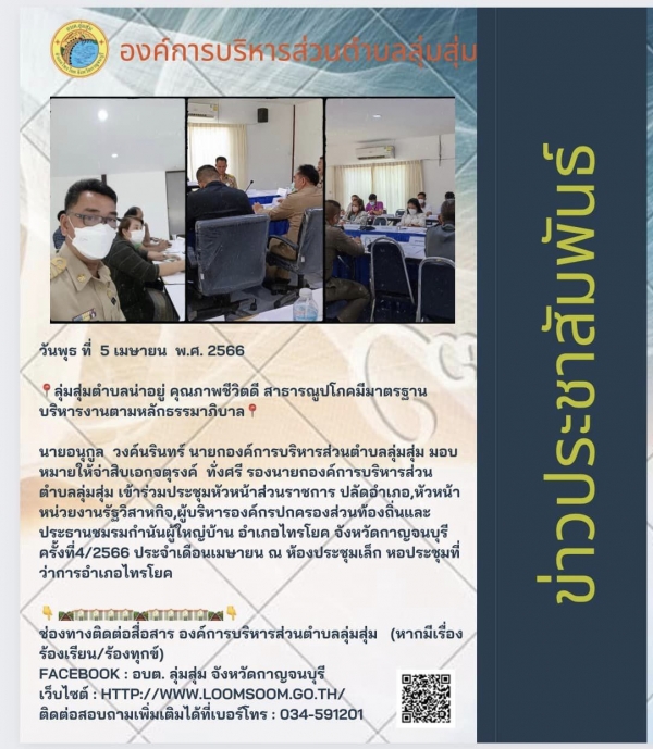นายอนุกูล วงค์นรินทร์ นายกองค์การบริหารส่วนตำบลลุ่มสุ่ม มอบหมายให้จ่าสิบเอกจตุรงค์ ทั่งศรี รองนายกองค์การบริหารส่วนตำบลลุ่มสุ่ม เข้าร่วมประชุมหัวหน้าส่วนราชการ ปลัดอำเภอ,หัวหน้าหน่วยงานรัฐวิสาหกิจ,ผู้บริหารองค์กรปกครองส่วนท้องถิ่นและประธานชมรมกำนันผู้ใหญ่บ้าน อำเภอไทรโยค จังหวัดกาญจนบุรี ครั้งที่ 4/2566 ประจำเดือนเมษายน ณ ห้องประชุมเล็ก หอประชุมที่ว่าการอำเภอไทรโยค