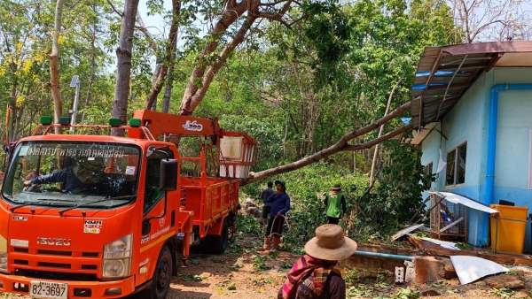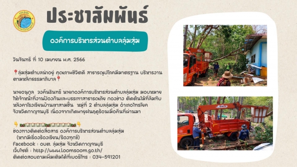นายอนุกูล วงค์นรินทร์ นายกองค์การบริหารส่วนตำบลลุ่มสุ่ม มอบหมายให้เจ้าหน้าที่งานป้องกันและบรรเทาสาธารณภัย กองช่าง ตัดต้นไม้ที่ล้มทับหลังคาโรงเรียนบ้านเขาสามชั้น หมู่ที่ 2 ตำบลลุ่มสุ่ม อำเภอไทรโยค จังหวัดกาญจนบุรี เนื่องจากเกิดพายุฝนฤดูร้อนเมื่อคืนที่ผ่