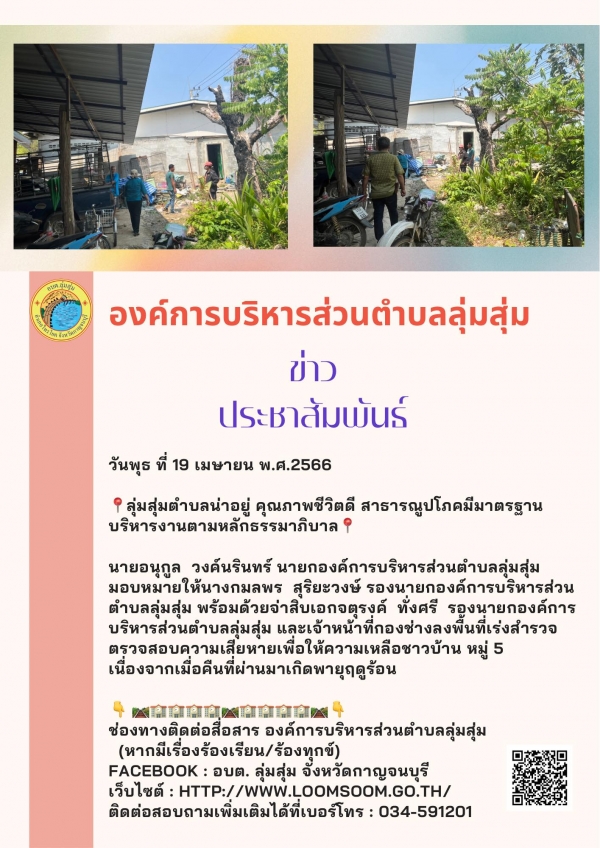 นายอนุกูล วงค์นรินทร์ นายกองค์การบริหารส่วนตำบลลุ่มสุ่ม มอบหมายให้นางกมลพร สุริยะวงษ์ รองนายกองค์การบริหารส่วนตำบลลุ่มสุ่ม พร้อมด้วยจ่าสิบเอกจตุรงค์ ทั่งศรี รองนายกองค์การบริหารส่วนตำบลลุ่มสุ่ม และเจ้าหน้าที่กองช่างลงพื้นที่เร่งสำรวจตรวจสอบความเสียหาย