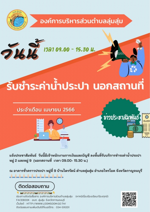 แจ้งประชาสัมพันธ์ วันนี้มีเจ้าพนักงานการเงินและบัญชี ลงพื้นที่รับบริการชำระค่าน้ำประปา หมู่ 2 และหมู่ 9 (นอกสถานที่ เวลา 09.00- 15.30 น.) ณ อาคารชั่วคราวประปา หมู่ที่ 9 บ้านไตรรัตน์ ตำบลลุ่มสุ่ม อำเภอไทรโยค จังหวัดกาญจนบุรี