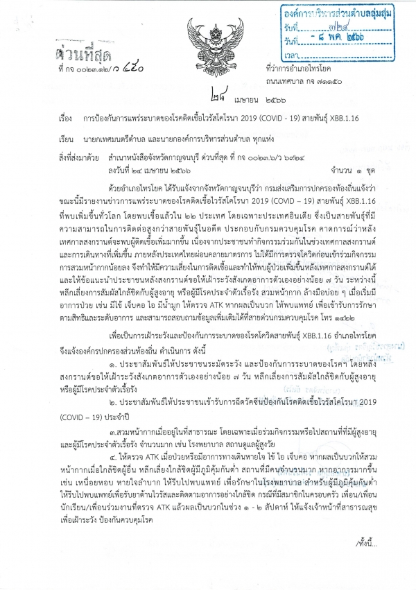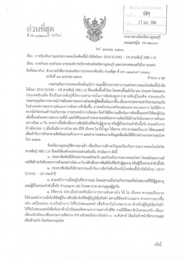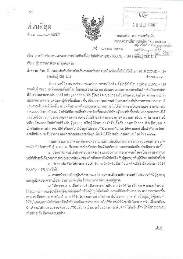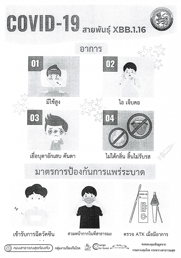 การป้องกันการแพร่ระบาดของโรคติดเชื้อไวรัสโคโรนา 2019 (Covid-19) สายพันธุ์ XBB.1.16