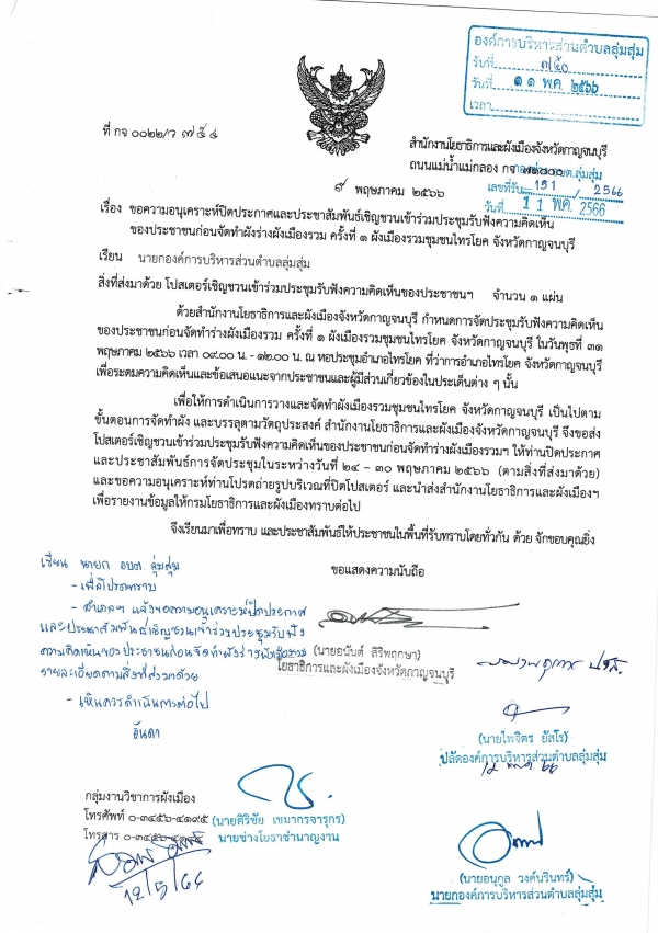 หนังสือขอความอนุเคราะห์ปิดประกาศและประชาสัมพันธ์เชิญชวนเข่าร่วมประชุมรับฟังความคิดเห็นของประชาชนก่อนจัดทำผังร่างเมืองรวม ครั้งที่ 1 ผังเมืองรวมชุมชนไทรโยค จังหวัดกาญจนบุรี