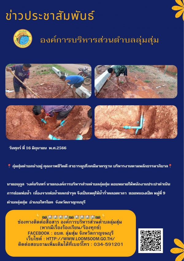 นายอนุกูล วงค์นรินทร์ นายกองค์การบริหารส่วนตำบลลุ่มสุ่ม มอบหมายให้พนักงานประปาดำเนินการซ่อมท่อน้ำ เนื่องจากท่อน้ำแตกชำรุด จึงเป็นเหตุให้น้ำรั่วตลอดเวลา ซอยหนองเป็ด หมู่ที่ 9 ตำบลลุ่มสุ่ม อำเภอไทรโยค จังหวัดกาญจนบุรี