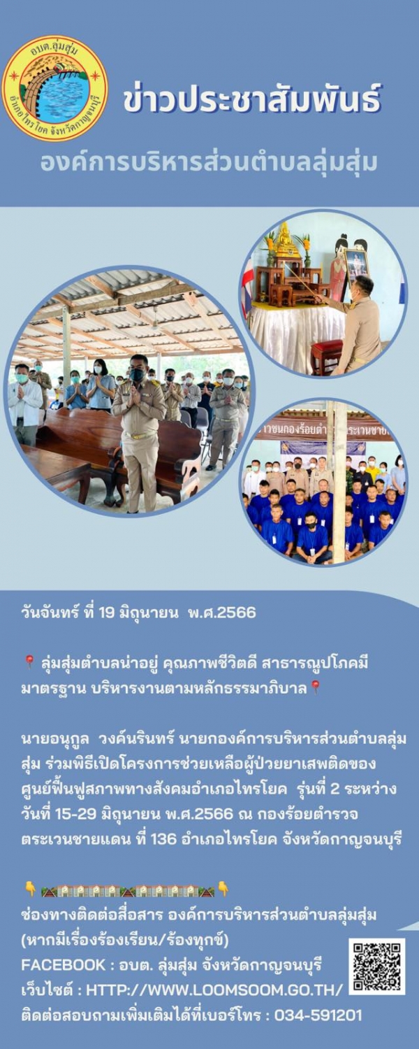 นายอนุกูล วงค์นรินทร์ นายกองค์การบริหารส่วนตำบลลุ่มสุ่ม ร่วมพิธีเปิดโครงการช่วยเหลือผู้ป่วยยาเสพติดของศูนย์ฟื้นฟูสภาพทางสังคมอำเภอไทรโยค รุ่นที่ 2 ระหว่างวันที่ 15-29 มิถุนายน พ.ศ.2566 ณ กองร้อยตำรวจตระเวนชายแดน ที่ 136 อำเภอไทรโยค จังหวัดกาญจนบุรี