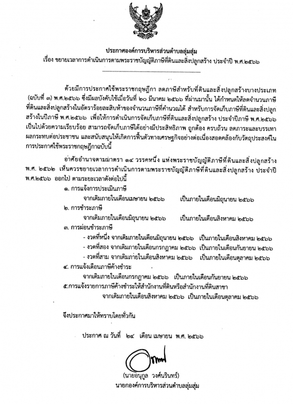 เรื่อง การขยายระยะเวลาการดำเนินการตามพระราชบัญญัติภาษีที่ดินและสิ่งปลูกสร้าง ประจำปี พ.ศ. 2566