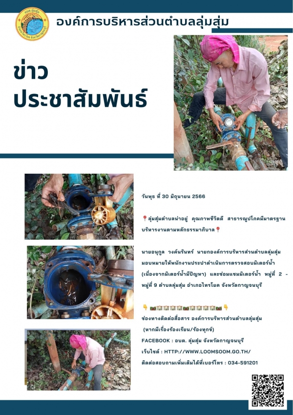 นายอนุกูล วงค์นรินทร์ นายกองค์การบริหารส่วนตำบลลุ่มสุ่ม มอบหมายให้พนักงานประปาดำเนินการตรวจสอบมิเตอร์น้ำ (เนื่องจากมิเตอร์น้ำมีปัญหา) และซ่อมแซมมิเตอร์น้ำ หมู่ที่ 2 - หมู่ที่ 9 ตำบลลุ่มสุ่ม อำเภอไทรโยค จังหวัดกาญจนบุรี