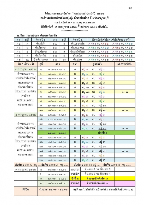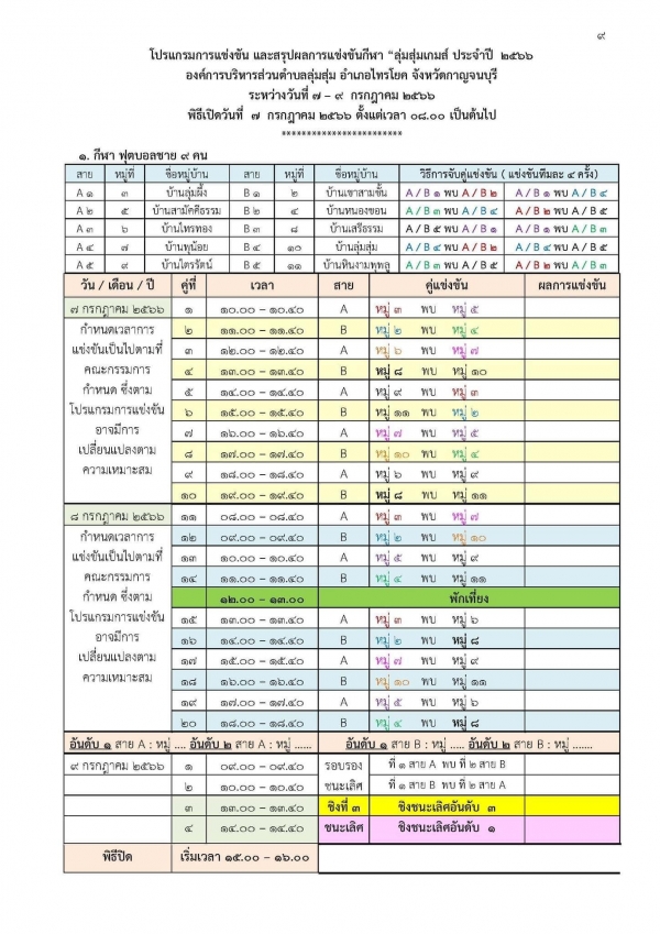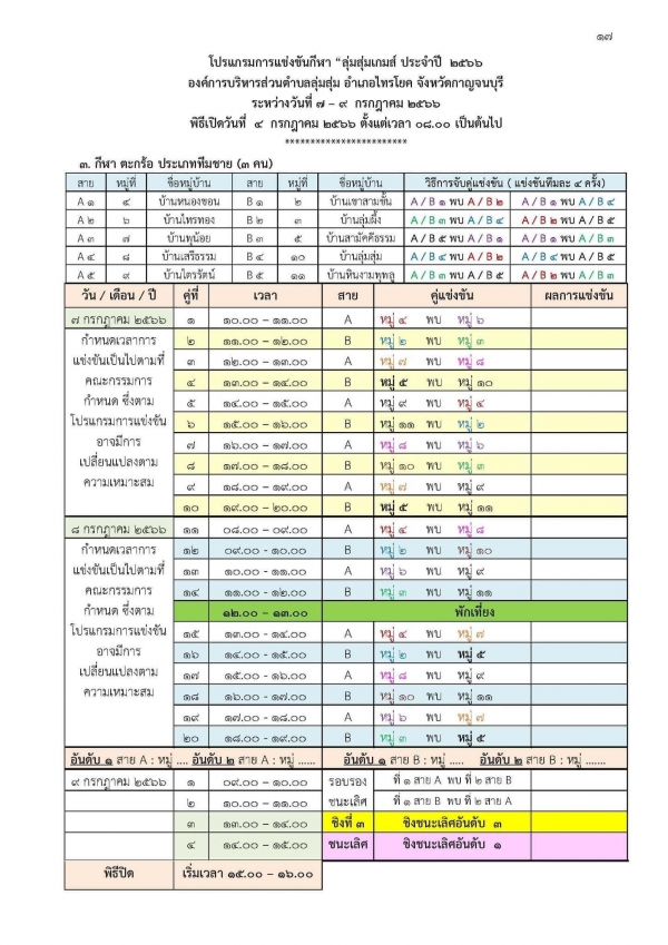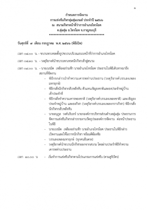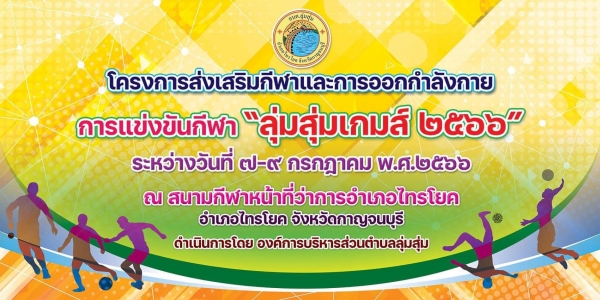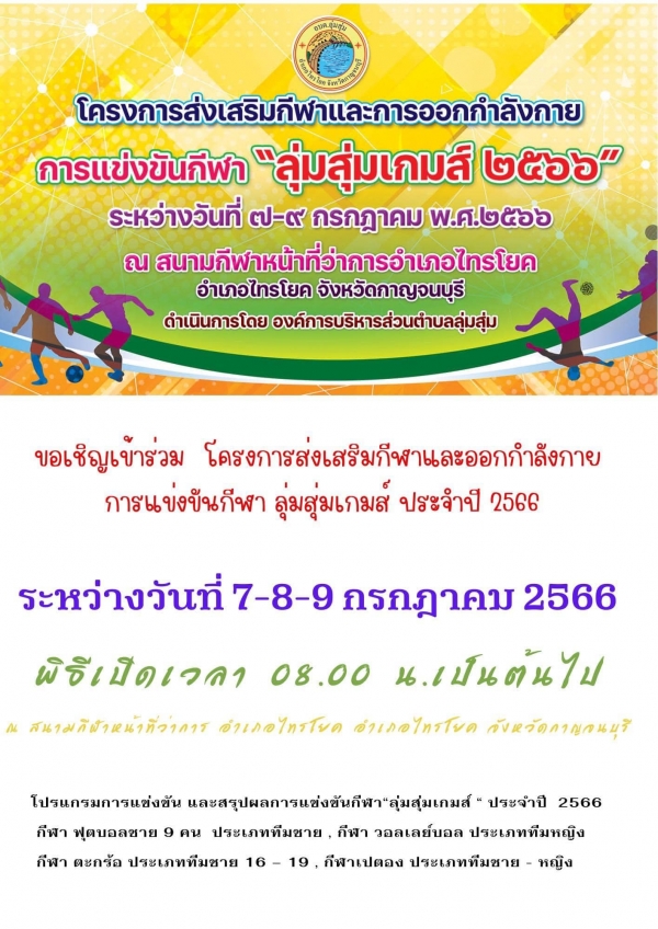 ขอเชิญชวนทุกท่านร่วมชมและร่วมเชียร์ การแข่งขันกีฬาหมู่บ้าน โครงการส่งเสริมกีฬาและออกกำลังกาย การแข่งขันกีฬา “ลุ่มสุ่มเกมส์ ครั้งที่ 1” ประจำปีงบประมาณ พ.ศ. 2566 ระหว่างวันที่ 7 – 9 กรกฎาคม 2566 ณ สนามกีฬาหน้าที่ว่าการอำเภอไทรโยค อำเภอไทรโยค จังหวัดกาญจนบุรี