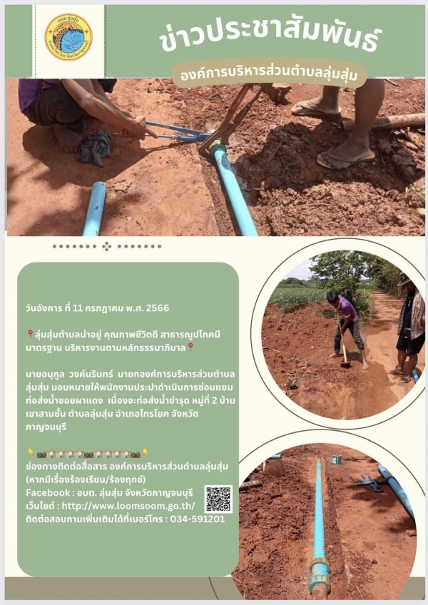 นายอนุกูล วงค์นรินทร์ นายกองค์การบริหารส่วนตำบลลุ่มสุ่ม มอบหมายให้พนักงานประปาดำเนินการซ่อมแซมท่อส่งน้ำซอยผาแดง เนื่องจะท่อส่งน้ำชำรุด หมู่ที่ 2 บ้านเขาสามชั้น ตำบลลุ่มสุ่ม อำเภอไทรโยค จังหวัดกาญจนบุรี