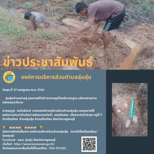 นายอนุกูล วงค์นรินทร์ นายกองค์การบริหารส่วนตำบลลุ่มสุ่ม มอบหมายให้พนักงานประปาดำเนินการซ่อมแซมท่อน้ำ ซอยจัดสรร เนื่องจะท่อน้ำชำรุด หมู่ที่ 9 บ้านไตรรัตน์ ตำบลลุ่มสุ่ม อำเภอไทรโยค จังหวัดกาญจนบุรี