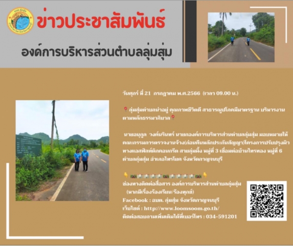 นายอนุกูล วงค์นรินทร์ นายกองค์การบริหารส่วนตำบลลุ่มสุ่ม มอบหมายให้คณะกรรมการตรวจงานจ้าง(ก่อนคืนหลักประกันสัญญา)โครงการปรับปรุงผิวทางแอสฟัลท์ติกคอนกรีต สายลุ่มผึ้ง หมู่ที่ 3 เชื่อมต่อบ้านไทรทอง หมู่ที่ 6 ตำบลลุ่มสุ่ม อำเภอไทรโยค จังหวัดกาญจนบุรี
