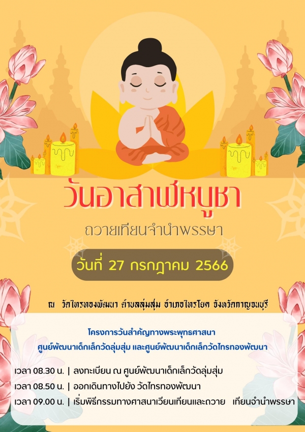 องค์การบริหารส่วนตำบลลุ่มสุ่ม …………. ขอเชิญพุทธศาสนิกชน ………….. ร่วมถวายเทียนจำนำพรรษา ประจำปี 2566 ในวันพฤหัสบดี ที่ 27 กรกฎาคม 2566 ณ วัดไทรทองพัฒนา ตำบลลุ่มสุ่ม อำเภอไทรทอง จังหวัดกาญจนบุรี