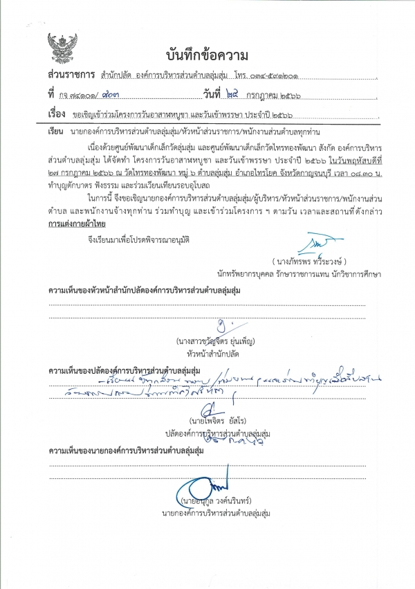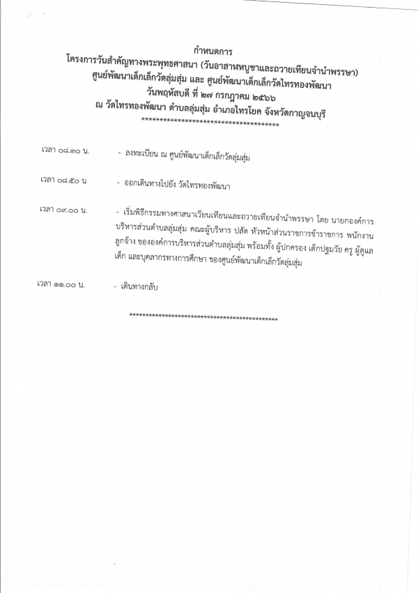 เวลา 08.30 น. ลงทะเบียน ณ ศูนย์พัฒนาเด็กเล็กวัดลุ่มสุ่ม