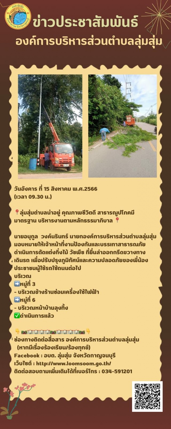 นายอนุกูล วงค์นรินทร์ นายกองค์การบริหารส่วนตำบลลุ่มสุ่ม มอบหมายให้เจ้าหน้าที่งานป้องกันและบรรเทาสาธารณภัย ดำเนินการตัดแต่งกิ่งไม้ วัชพืช ที่ยื่นลำออกกรีดขวางทางเดินรถ เพื่อปรับปรุงภูมิทัศน์และความปลอดภัยของพี่น้องประชาชนผู้ใช้รถใช้ถนนต่อไป