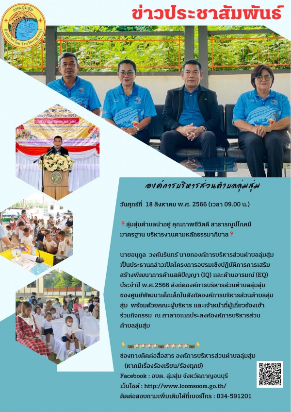 นายอนุกูล วงค์นรินทร์ นายกองค์การบริหารส่วนตำบลลุ่มสุ่ม เป็นประธานกล่าวเปิดโครงการอบรมเชิงปฏิบัติการการเสริมสร้างพัฒนาการด้านสติปัญญา (IQ) และด้านอารมณ์ (EQ) ประจำปี พ.ศ.2566 สังกัดองค์การบริหารส่วนตำบลลุ่มสุ่ม ของศูนย์พัฒนาเด็กเล็กในสังกัดองค์การบริหารส่วนตำบลลุ่มสุ่ม พร้อมด้วยคณะผู้บริหาร และเจ้าหน้าที่ผู้เกี่ยวข้องเข้าร่วมกิจกรรม