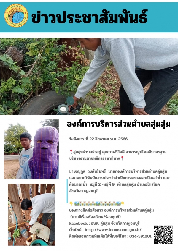 นายอนุกูล วงค์นรินทร์ นายกองค์การบริหารส่วนตำบลลุ่มสุ่ม มอบหมายให้พนักงานประปาดำเนินการตรวจสอบมิเตอร์น้ำ และ ตัดมาตรน้ำ หมู่ที่ 2 -หมู่ที่ 9 ตำบลลุ่มสุ่ม อำเภอไทรโยค จังหวัดกาญจนบุรี