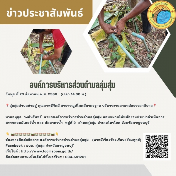 นายอนุกูล วงค์นรินทร์ นายกองค์การบริหารส่วนตำบลลุ่มสุ่ม มอบหมายให้พนักงานประปาดำเนินการตรวจสอบมิเตอร์น้ำ และ ตัดมาตรน้ำ หมู่ที่ 9 ตำบลลุ่มสุ่ม อำเภอไทรโยค จังหวัดกาญจนบุรี