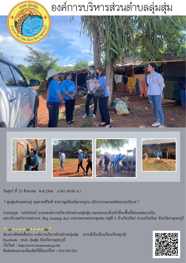 นายอนุกูล วงค์นรินทร์ นายกองค์การบริหารส่วนตำบลลุ่มสุ่ม มอบหมายเจ้าหน้าที่ลงพื้นที่ซ่อมแซม ภายใน และบริเวณทำความสะอาด (Big cleaning day) อาคารตลาดกลางชุมชน หมู่ที่ 9 บ้านไตรรัตน์ อำเภอไทรโยค จังหวัดกาญจนบุรี