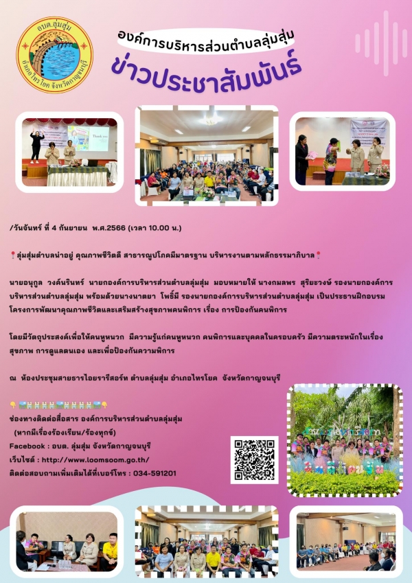 นายอนุกูล วงค์นรินทร์ นายกองค์การบริหารส่วนตำบลลุ่มสุ่ม มอบหมายให้ นางกมลพร สุริยะวงษ์ รองนายกองค์การบริหารส่วนตำบลลุ่มสุ่ม พร้อมด้วยนางนาตยา โพธิ์มี รองนายกองค์การบริหารส่วนตำบลลุ่มสุ่ม เป็นประธานฝึกอบรมโครงการพัฒนาคุณภาพชีวิตและเสริมสร้างสุขภาพคนพิการ เรื่อง การป้องกันคนพิการ