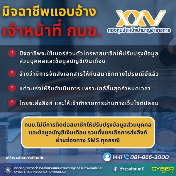 กบข.ไม่มีการติดต่อสมาชิกให้ปรับปรุงข้อมูลส่วนบุคคล และข้อมูลบัญชีเงินเดือน รวมทั้งยกเลิกการส่งลิงก์ผ่านช่องทาง SMS ทุกกรณี