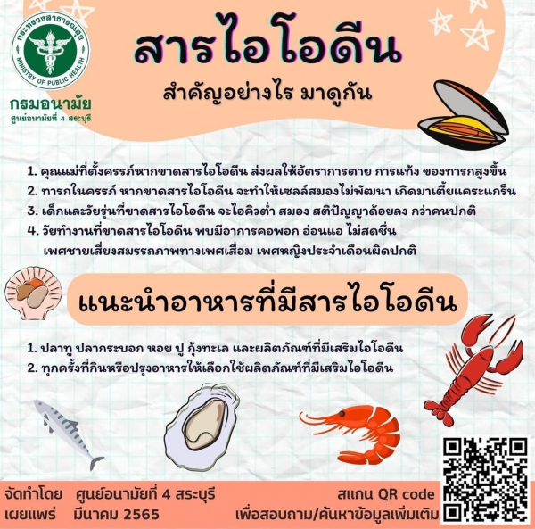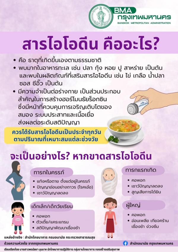 "รู้หรือไม่... คนเราต้องได้รับสารไอโอดีน มากน้อยเพียงใด" สารไอโอดีน คืออะไร ?? ไอโอดีน สิ่งสำคัญไม่ควรมองข้าม จำเป็นต่อการเจริญเติบโตของร่างกายและการพัฒนาสมอง หากขาดไอโอดีนก็จะมีผลกระทบต่อร่างกายในทุกช่วงวัย ทั้งนี้ควรเลือกรับประทานอาหารที่มีไอโอดีนแ