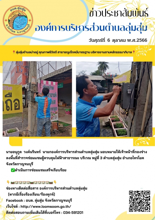 นายอนุกูล วงค์นรินทร์ นายกองค์การบริหารส่วนตำบลลุ่มสุ่ม มอบหมายให้เจ้าหน้าที่กองช่าง ลงพื้นที่สำรวจซ่อมแซมตู้ควบคุมไฟฟ้าสาธารณะ บริเวณ หมู่ที่ 3 ตำบลลุ่มสุ่ม อำเภอไทรโยค จังหวัดกาญจนบุรี