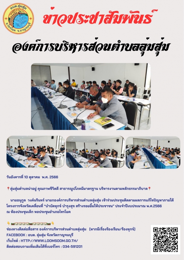 นายอนุกูล วงค์นรินทร์ นายกองค์การบริหารส่วนตำบลลุ่มสุ่ม เข้าร่วมประชุมติดตามผลการแก้ไขปัญหาภายใต้โครงการจังหวัดเคลื่อนที่ “บำบัดทุกข์ บำรุงสุข สร้างรอยยิ้มให้ประชาชน” ประจำปีงบประมาณ พ.ศ.2566 ณ ห้องประชุมเล็ก หอประชุมอำเภอไทรโยค