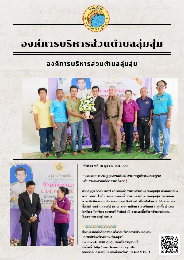 นายอนุกูล วงค์นรินทร์ นายกองค์การบริหารส่วนตำบลลุ่มสุ่ม มอบหมายนางนาตยา โพธิ์มี รองนายกองค์การบริหารส่วนตำบลลุ่มสุม ร่วมแสดงความยินดีและต้อนรับ ผอ.ศุภกฤต จีนจันทร์ เนื่องในโอกาสได้รับการแต่งตั้งให้ดำรงตำแหน่งผู้อำนวยการสถานศึกษา โรงเรียนบ้านลุ่มผึ้ง อำเภอไทรโยค จังหวัดกาญจนบุรี สังกัดสำนักงานเขตพื้นที่การศึกษาประถมศึกษากาญจนบุรี เขต 3