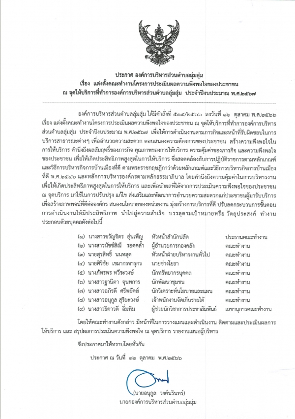 ประกาศ-คำสัง เรื่องแต่งตั้งคณะทำงานโครงการประเมินผลความพึงพอใจของประชาชน ณ จุดดให้บริการที่ทำการองค์การบริหารส่วนตำบลลุ่มสุ่ม ประจำปีงบประมาณ พ.ศ.2567