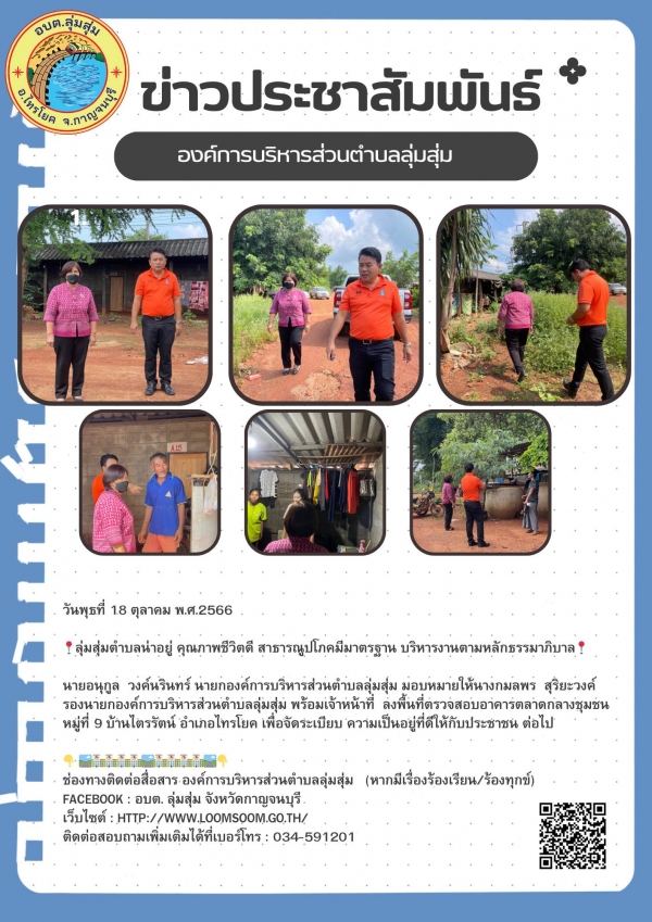 นายอนุกูล วงค์นรินทร์ นายกองค์การบริหารส่วนตำบลลุ่มสุ่ม มอบหมายให้นางกมลพร สุริยะวงค์ รองนายกองค์การบริหารส่วนตำบลลุ่มสุ่ม พร้อมเจ้าหน้าที่ ลงพื้นที่ตรวจสอบอาคารตลาดกลางชุมชน หมู่ที่ 9 บ้านไตรรัตน์ อำเภอไทรโยค เพื่อจัดระเบียบ ความเป็นอยู่ที่ดีให้กับประชาชน ต่อไป