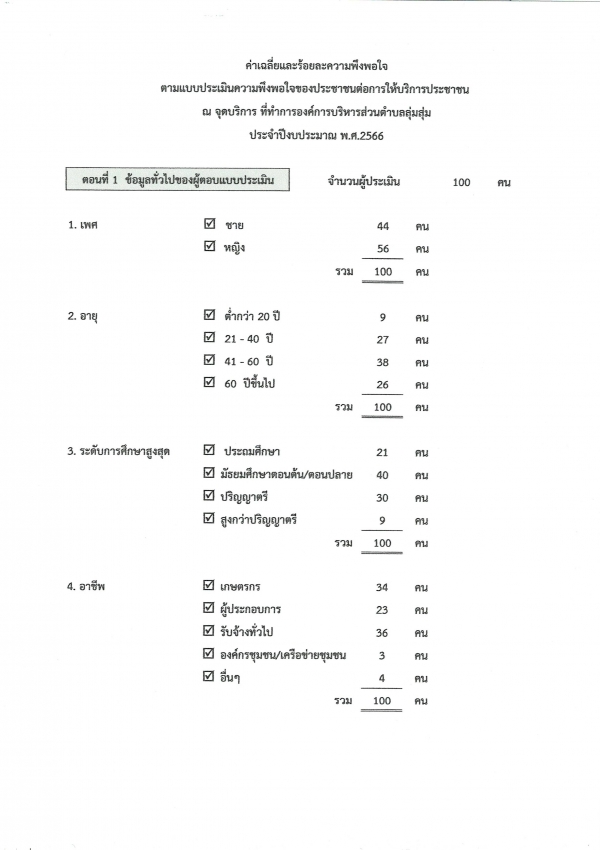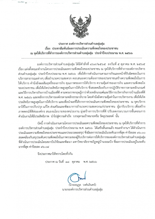 ประกาศองค์การบริหารส่วนตำบลลุ่มสุ่ม เรื่อง ประชาสัมพันธ์ผลการประเมินความพึงพอใจของประชาชน ณ จุดให้บริการที่ทำการองค์การบริหารส่วนตำบลลุ่มสุ่มประจำปีงบประมาณ พ.ศ.2566