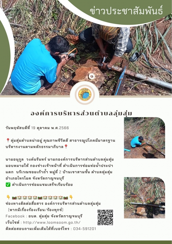 นายอนุกูล วงค์นรินทร์ นายกองค์การบริหารส่วนตำบลลุ่มสุ่ม มอบหมายให้ กองช่างเจ้าหน้าที่ ดำเนินการซ่อมท่อน้ำประปาแตก บริเวณซอยเก้าถ้ำ หมู่ที่ 2 บ้านเขาสามชั้น ตำบลลุ่มสุ่ม อำเภอไทรโยค จังหวัดกาญจนบุรี