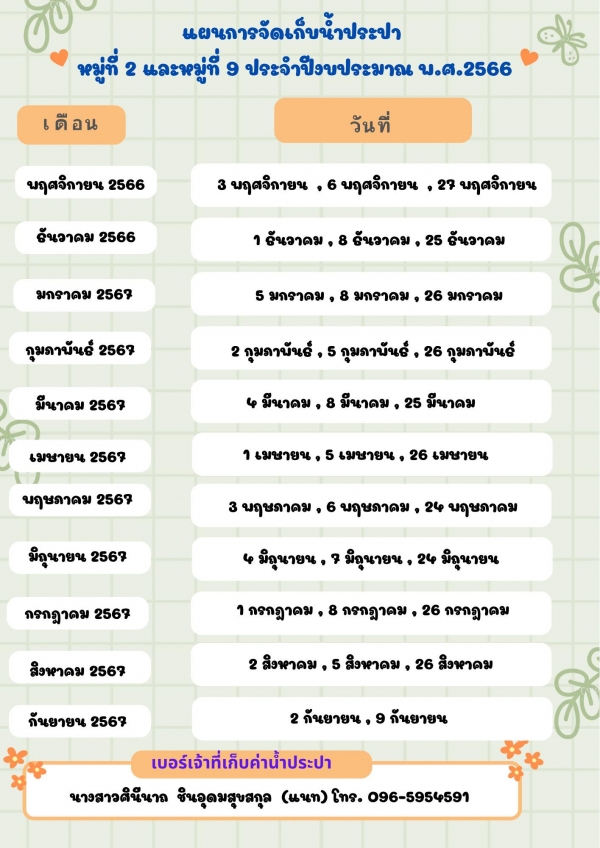 แผนจัดเก็บค่าน้ำประปา หมู่ 2 และหมู่ที่ 9 ประจำปีงบประมาณ พ.ศ.2567 ณ อาคารชั่วคราวหมู่ที่ 9 เวลา 09.00-15.30